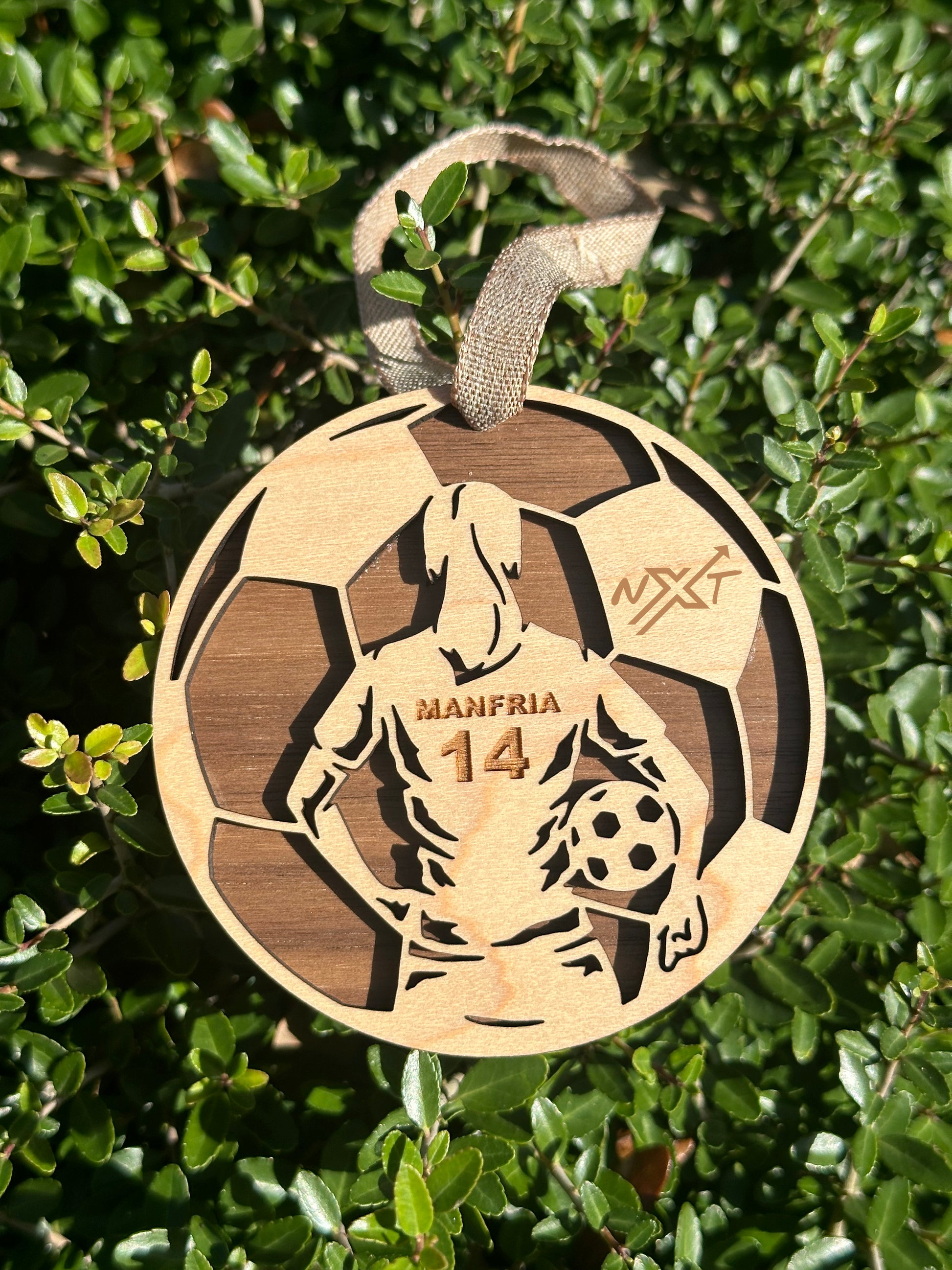 Enhance your holiday decor with our NXT Soccer Ornaments, where the passion of the pitch meets festive cheer. This unique collection features a silhouette of a female soccer players, framed by a classic soccer ball shape. Personalize the ornament with your name and jersey number to celebrate your love for the sport, making it the perfect addition for athletes and fans alike.